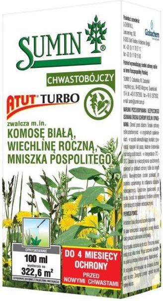 Herbicyd w formie koncentratu stężonej zawiesiny do rozcieńczania wodą (SC), stosowanym nalistnie, przeznaczony do zwalczania chwastów na terenach nieużytkowanych rolniczo. Zwalcza chwasty jednoliścienne i dwuliścienne (jednoroczne i wieloletnie).Substancje czynne:diflufenikan – 40 g/lglifosat – 250 g/l Środek przeznaczony do stosowania przez użytkowników nieprofesjonalnych.Herbicyd zawiera dwie substancje czynne:Diflufenikan jest to substancja o działaniu kontaktowym, po zastosowaniu przez dłuższy okres na powierzchni gleby tworzy cienką warstwę, pobierana głównie przez liście oraz częściowo przez korzenie chwastów.Glifosat to substancja o działaniu układowym, pobierana przez liście chwastów i transportowana do stożków wzrostu w ciągu ok. 10 dni.Połączenie tych dwóch substancji czynnych oznacza, że środek jest herbicydem nieselektywnym, zwalczającym chwasty po wschodach Atut Turbo wykazuje długotrwałe działanie na jeszcze nie kiełkujące chwasty przez okres 3-4 miesięcy. Objawy działania środka widoczne są po 1-2 tygodniach.Najlepszy efekt chwastobójczy uzyskuje we wczesnych fazach rozwojowych chwastów. Wilgotna gleba sprzyja skuteczności preparatu.Uprawa:Tereny nieużytkowe rolnicze (nieutwardzone) Chwasty:komosa biała, ostrożen polny, rumianek pospolity, tasznik pospolity, wiechlina rocznaDawkowanie:31 ml/100m2/2 l wodyKarencja:Nie dotyczyZe środków ochrony roślin należy korzystać z zachowaniem bezpieczeństwa. Przed każdym użyciem przeczytaj informacje zamieszczone w etykiecie i informacje dotyczące produktu.