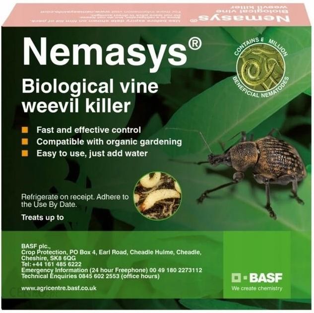 Nemasys Pożyteczne Nicienie 6 mln Na OpuchlakiBio-insektycydyZaawansowana ochrona biologiczna w ogrodnictwie.Naturalny wybór na opuchlaka.Jak działają nicienie:Nasze specjalnie wyselekcjonowane nicienie atakują szkodniki, penetrując je poprzez naturalne otwory ciała lub przez naskórek.W środku uwalniają bakterie, które powstrzymują szkodniki przed żerowaniem, szybko je zabijając.Nicienie nie poprzestają na tym. Rozmnażają się dalej wewnątrz martwego szkodnika, a nowe pokolenia głodnych nicieni polują na dalszą zdobycz.Kiedy nicienie nie znajdą już ofiary, ich populacja ulega redukcji do pierwotnego stanu.UWAGA!Towar nie podlega zwrotowi ze wglądu na zawartość oraz rodzaj przechowywania.W celu uzyskania optymalnych rezultatów:Oprysk należy przeprowadzać, gdy występują poczwarki opuchlaka tj. wcześnie wiosną, lub wczesną jesienią przeciwko larwom.Temperatura gruntu lub podłoża powinna mieścić się w zakresie od 5 do 30°C przez co najmniej dwa tygodnie po oprysku.Gleba lub podłoże powinny być wilgotne.Poddawać rutynowo opryskowi cały nowy materiał docierający do gospodarstwa, może zawierać on larwy opuchlaka.Jeśli produkt jest nakładany na całe rośliny, natychmiast spłukać nicienie do podłoża.Metodą preferowaną jest podlewanie, zwłaszcza w przypadku gdy rośliny mają silnie rozwiniętą rozetę liści.Stosowanie w przypadku truskawek: nanosić preparat bezpośrednio dookoła u podstawy każdej rośliny.Do zwalczania stadiów larwalnych opuchlaka truskawkowca (Otiorhynchus sulcatus) występującego w uprawach w gruncie lub pod osłonami w pojemnikach. Zawiera nicienie pasożytnicze Steinernema kraussei (88%) i obojętny nośnik z wodą (12%).SPOSÓB UŻYCIA• Usunąć wszystkie drobne filtry (mesh 50 lub drobniejsze) z opryskiwacza.• Napełnić częściowo zbiornik czystą chłodną wodą. Uruchomić mieszadło i nie wyłączać go do końca opryskiwania.• Wsypać zawartość jednej tacy do wiadra i wlać co najmniej 10 litrów wody.• Wymieszać zawartość starannie do uzyskania jednorodnej zawiesiny• Wlać zawiesinę nicieni do zbiornika przez sito opryskiwacza.• Napełnić zbiornik wodą do wymaganego poziomu.• Zabieg wykonać natychmiast po sporządzeniu cieczy roboczej.• Natychmiast po zabiegu wykonać deszczowanie by wmyć nicienie do gleby; roślin w pojemnikach nie podlewać, by roztwór nie przelał się przez górną krawędź pojemników.WARUNKI STOSOWANIAW celu uzyskania optymalnych rezultatów:• Oprysk należy przeprowadzać, gdy występują larwy opuchlaka.• Temperatura gruntu lub podłoża powinna mieścić się w zakresie od 5 do 30°C przez co najmniej dwa tygodnie po oprysku.• Gleba lub podłoże powinny być wilgotne.• Poddawać rutynowo opryskowi cały nowy materiał docierający do gospodarstwa, może zawierać on larwy opuchlaka.• Jeśli produkt stosowany jest na liście, natychmiast podlać czystą wodą.• Podlewanie to metoda preferowana, zwłaszcza w przypadku gdy rośliny mają silnie rozwiniętą rozetę liści .• Stosowanie w przypadku truskawek: , nanosić preparat bezpośrednio u podstawy każdej rośliny.ŚRODKI OSTROŻNOŚCI• Podczas oprysku cały czas mieszać zawiesinę nicieni.• Nie używać produktu po dacie przydatności do użytku lub jeśli produkt był niewłaściwie przechowywany.• Więcej informacji o zgodności środków chemicznych z preparatem Nemasys® L można uzyskać u dystrybutora lub w witrynie www.nemasyspro.com• Po otwarciu należy natychmiast zużyć całą zawartość tacy (nie wolno jej dzielić, przechowywać otwartych opakowań ani rozcieńczonej zawiesiny).• Nemasys działa przez około cztery tygodnie; zwalczanie larw po tym czasie może być niewystarczające.• Nemasys nie zwalcza dorosłych osobników opuchlaka.• Nie przekraczać ciśnienia roboczego 300 psi/20 barów/2000 kPa.• Średnica dyszy powinna być większa niż 0,5 mm.Przechowywanie: Po otrzymaniu zużyć natychmiast lub przechowywać w lodówce w temperaturze 5°C. NIE ZAMRAŻAĆ. Zużyć naraz całą zawartośćopakowania. Nie dzielić poszczególnych opakowań, gdyż każde zawiera określoną dawkę nicieni. Nie przechowywać rozcieńczonego produktu. PRZECHOWYWAĆ W MIEJSCU NIEDOSTĘPNYM DLA DZIECI. PRODUKTY TE ZAWIERAJĄ ŻYWE ORGANIZMY I WYMAGAJĄ SPECJALNYCH PROCEDUR OBROTU I STOSOWANIA. ŚCISŁE PRZESTRZEGANIE INSTRUKCJI POZWOLI ZAPEWNIĆ MAKSYMALNĄ AKTYWNOŚĆ.Firma oświadcza, że niniejszy produkt jest zgodny z opisem na etykiecie i jest przeznaczony do celu określonego na etykiecie pod warunkiem ścisłego przestrzegania wskazań.