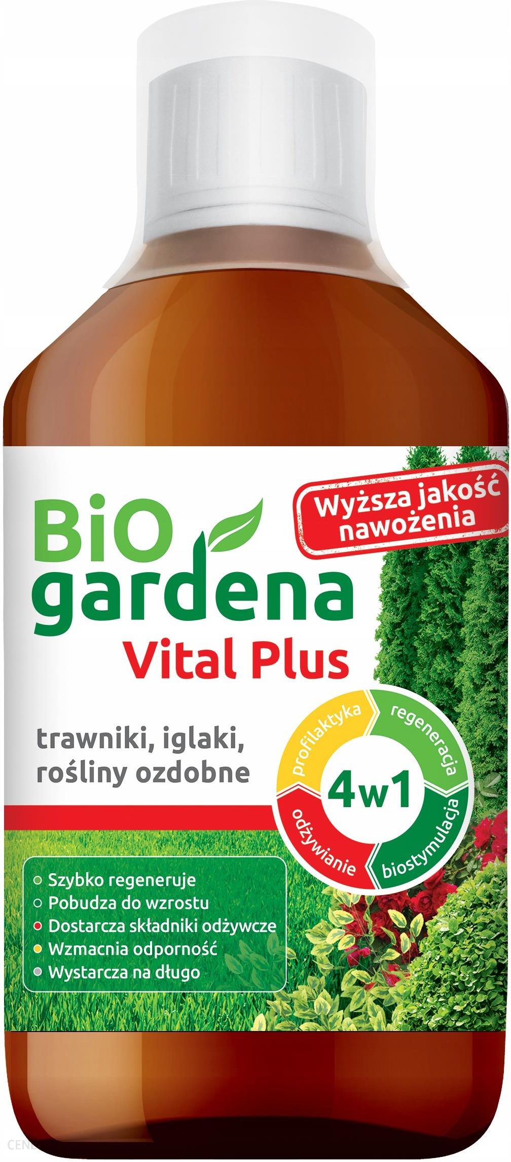 NAWÓZ W PŁYNIE BIOGARDENA VITAL PLUS 4w1 450mlNawóz Vital Plus BiOgardena można stosować zarówno doglebowo jak i w formie oprysku do wszystkich kwiatów, owoców, warzyw, ziół, a także do regeneracji trawnika.Wspomaga wzrost roślin, pozytywnie wpływa na wybarwienie liści, kwiatów i owoców oraz stymuluje regenerację roślin, które ucierpiały w wyniku suszy, przelania, chorób grzybowych czy ataku szkodników.Odżywia rośliny, wzmacnia ich odporność na choroby i szkodniki oraz jest biostymulatorem kwitnienia i owocowania.Działa błyskawicznie, już 6 godzin po zastosowaniu.Jedna butelka 450 ml wystarcza na około 90 litrów podlewania lub 180 litrów oprysku.Idealnie nadaje się do:regeneracji trawnika – pomaga w pozbyciu się nieestetycznych plam spowodowanych suszą czy chorobami grzybowymiroślin ozdobnych – poprawia wybarwienie liści i kwiatówowoców i warzyw – nie wymaga stosowania okresu karencjiziół – pozytywnie wpływa na ich walory smakowe i zapachoweroślin doniczkowych – jest bezpieczny dla ludzi i zwierząt domowychDawkowanie:Doglebowo: 5 ml/1 l wodyOprysk: 2,5 ml/1 l wodySkład nawozu:Azot organiczny (N): 9%Węgiel organiczny (C): 24,5%Zawartość aminokwasów > 50%pH w wodzie: 5-6