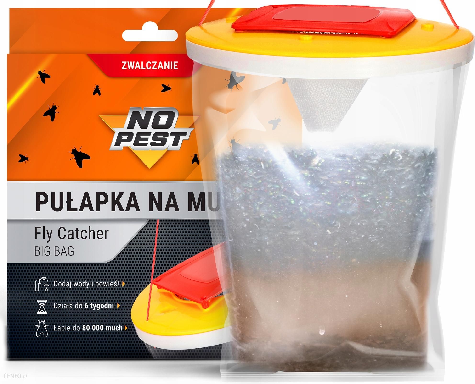 Najskuteczniejsza pułapka na muchy No PestDuża pułapka na owady No Pest Fly Catcher Big Bag✅ Przeznaczenie: na muchy✅ Działa aż do 6 tygodni!✅ Łapie aż do 80 000 much!✅ Łatwy i szybki w użyciu sposób na muchy✅ Wykonana z wytrzymałych materiałów✅ Produkt renomowanego producentaNajlepsza pułapka na muchy z atraktantem No Pest Fly CatcherMuchy otaczają Twój dom, a tradycyjne środki nie działają? Wybierz Pułapkę na muchy No Pest, a pozbędziesz się natrętnych owadów w krótkim czasie! Zaufaj sprawdzonej marce No Pest.Dzięki zastosowaniu specjalnej konstrukcji i środka wabiącego, muchy wchodzą do pułapki lecz nie mogą już z niej wyjść. Pułapka jest tak duża, że może złapać aż do 80 000 much!Atraktant do pułapki No Pest wykonany jest ze specjalnie dobranych składników spożywczych. Jest kompletnie bezpieczny dla środowiska i nie zawiera żadnej chemii.Pułapka powinna być stosowana na zewnątrz, w miejscach rozmnażania się owadów (komposty, kontenery na śmieci, oborniki)ZastosowaniePułapka swoje zastosowanie znajduję na zewnątrz w miejscach dobrze oświetlonych gdzie rozmnażają się muchy, np. oborniki, kompost, kontenery na śmieci itd.Zawartość zestawu:1x Pułapka na muchy No Pest Fly Catcher1x Atraktant do pułapki No PestSposób użyciaPułapka na muchy No Pest jest idealnym sposobem na pozbycie się irytujących owadów z naszego otoczenia. Do głównego pojemnika należy wsypać zawartość woreczka z atraktantem oraz całość zalać 1 litrem wody. Po tych czynnościach wystarczy powiesić worek na muchy w odpowiednim miejscu.Pułapka najlepiej sprawdzi się blisko dobrze nasłonecznionych miejsc rozmnażania się owadów. Pod wpływem temperatury atraktant fermentuje i wydziela intensywny zapach, który skutecznie wabi wszystkie muchy w okolicy. Po niespełna 4 dniach pułapka osiągnie swoją wydajność.Galeria