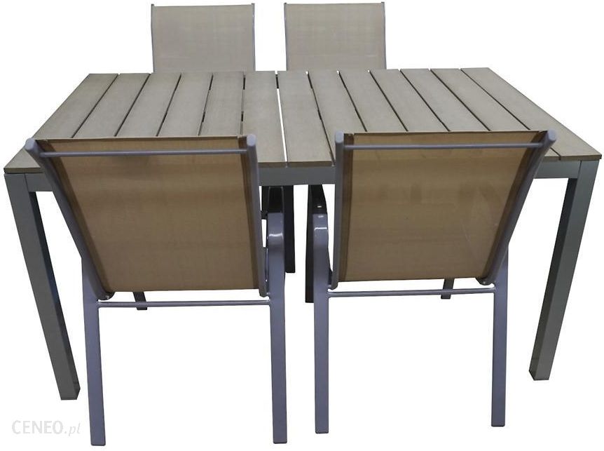 Stół Polywood idealnie wpasuje się w kompozycje każdego balkonu, tarasu czy ogrodu. Jego nowoczesny design przypadnie do gustu każdemu. Konstrukcją stołu jest aluminium, natomiast blat został wykonany z polywoodu – materiału cechującego się wytrzymałością, jest to rodzaju deski kompozytowej. Mimo tego, że blat przypomina naturalne drewno, co jest oczywiście zaletą, materiał ten jest odporny na warunki atmosferyczne. Stół występuje w trzech kolorystykach, dzięki czemu każdy znajdzie odpowiedni dla swojego wystroju.Uniwersalne krzesło zarówno wewnętrzne jak i zewnętrzne. Tkanina, która została naciągnięta maksymalnie, zapewnia komfort i wygodę, nie potrzebne są dodatkowe poduszki. Materiał został opleciony i zszyty na grubych rurach, co sprawia, że nie naciąga się i nie odkształca. Nogi wzmocnione są podwójnie. Rama wykonana jest z metalu i pomalowana proszkowo, dzięki temu jest wytrzymała, a powierzchnia jest gładka i błyszcząca. Krzesło jest łatwe w utrzymaniu czystości, wystarczy przetrzeć materiał wilgotną szmatką. Polywood – to materiał wykonany w 100% z tworzywa sztucznego, do złudzenia przypominający wizualnie drewno. Materiał jest wyjątkowo odporny na czynniki atmosferyczne. Materiał w 100% nadaje się do recyklingu.