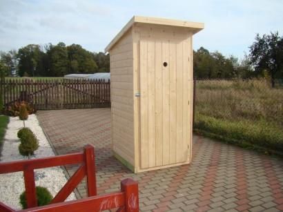Toaleta WC na działkę z drewna świerkowego, solidnie wykonana i estetyczna.