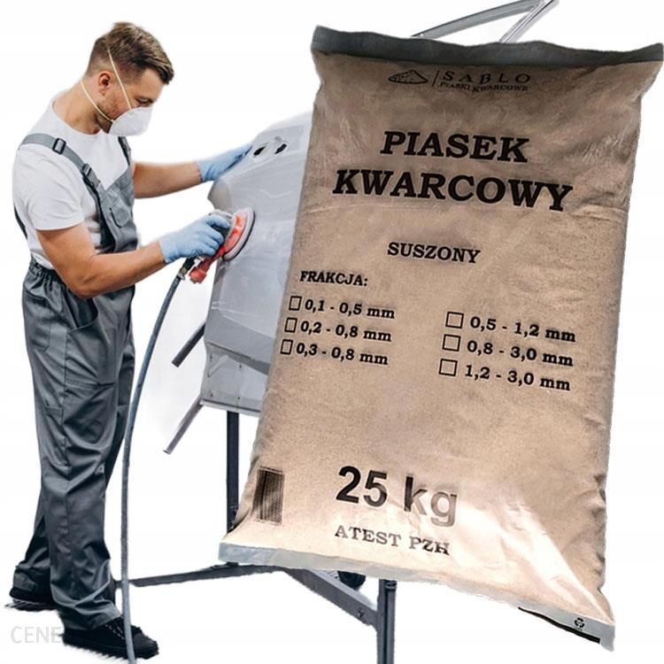 PIASEK KWARCOWY DO PIASKOWANIA SABLO 25kgPROSIMY O PODANIE FRAKCJI W WIADOMOŚCI.CZYSTY SUCHY PIASEK Z KWARCU (97%) – DO PIASKARKI, MYJKI PIASKUJĄCEJ i HYDROPIASKOWANIA w 25-kilogramowych workach.TANI DOBRY PREMIUM – GWARANCJA JAKOŚCI – ATEST PZHPIASEK DO CZYSZCZENIA:zastosowanie do czyszczenie piaskiem powierzchni, rogów i zagłębień:Metalowych metalDrewnianych drewnoCzęści samochodoweKonstrukcji stalowychBetonuFelgKaroserii samochodowychCegły ścian elewacji murówStarych obiektów konserwacji zabytkówOferujemy piasek kwarcowy (zawartość kwarcu powyżej 97%).METODA: strumieniowo-ścierna i hydropiaskowanie.Piasek wydobywany jest spod lustra wody, posiada sferyczny kształt ziarna, a jego wilgotność nie przekracza 0,2%.W pierwszej kolejności piasek zostaje wielokrotnie płukany, następnie oczyszczany przez hydrocyklony, frakcjowany, aby następnie został odpylony oraz osuszony w suszarni fluidalnej, dzięki czemu oferowany przez Nas produkt nie posiada wtrąceń zapachowych.W procesie piaskowania bardzo ważne jest, aby dobrać rodzaj ścierniwa do powierzchni, na której będzie wykorzystywane. Kupując nasz produkt, możesz mieć pewność jego wysokiej jakości – oferowany przez firmę Sablo produkt składa się w 97% z kwarcu. Pozwala to na dokładne oczyszczenie nawet trudno dostępnych rogów i zagłębień.Zastosowanie FRAKCJA:0,1-0,5 mm do miękkich metali, drewno, lekka korozja0,2-0,8 mm usuwanie powłok malarskich i korozji0,3-0,8 mm powierzchnie aluminiowe, stalowe oraz betonowe0,5-1,2 mm średnie grubości powłoki malarskie i korozja0,8-3,0 mm mocno skorodowane elementy stalowe1,2-3,0 mm bardzo mocno skorodowane powierzchnieProsimy o podanie wybranej przez Państwa frakcji w wiadomości do sprzedającego. W przypadku braku wiadomości wysyłamy piasek o frakcji 0,2 – 0,8mm lub 0,3 – 0,8mm.Gwarantujemy, że sprzedawany przez nas w Poznaniu piasek z atestem jest zawsze najwyższej jakości. Jest on przygotowywany z użyciem najlepszych metod i nowoczesnych technologii. Pomimo tego cena piasku do piaskownicy z atestem, który znajduje się w naszej ofercie, jest niezwykle konkurencyjna
