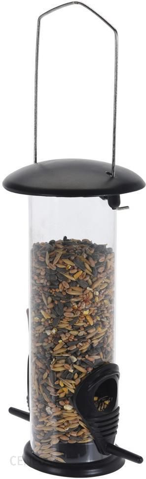 Karmnik dla ptaków na ziarno. Posiada dwa otwory z siedziskami.Materiał: tworzywo, metal.Wymiary: śr. 10cm, wys. 23cm.
