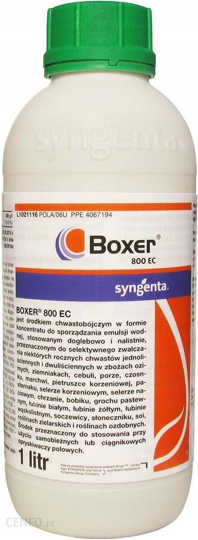 Boxer 800 EC środek chwastobójczy w formie koncentratu do sporządzania emulsji wodnej, stosowany nalistnie, przeznaczony do selektywnego zwalczania niektórych jednorocznych chwastów jednoliściennych oraz dwuliściennych w pszenicy ozimej. BOXER 800 EC jest pobierany przez chwasty w ciągu 1 godziny od zastosowania, opady deszczu występujące po tym terminie nie obniżają skuteczności działania środka.Chwasty wrażliwe np.: gwiazdnica pospolita, jasnoty, miotła zbożowa, przetaczniki, przytulia czepna, rumian polny, samosiewy rzepaku, tasznik pospolity, tobołki polneChwasty średnio wrażliwe np.: bodziszek drobnyChwasty odporne np.: chaber bławatek, mak polny, rdest powojowy, rdest ptasi, chwasty wieloletnie„Ze środków ochrony roślin należy korzystać z zachowaniem bezpieczeństwa. Przed każdym użyciem przeczytaj informacje zamieszczone w etykiecie i informacje dotyczące produktu. Należy zwrócić uwagę na szczegółowe wskazania dotyczące ryzyka. Należy stosować się do zasad bezpieczeństwa zawartych w etykiecie””W przypadku Produktów będących środkami ochrony roślin w rozumieniu ustawy o środkach ochrony roślin z dnia 8 marca 2013 r. (Dz.U. 2013 poz. 455 ze zm.) oraz rozporządzenia nr 1107/2009 (Dz.U. 2011 nr 284 poz. 1673 ze zm.), złożyć Zamówienie oraz być stroną Umowy Sprzedaży mogą jedynie Klienci będący osobami fizycznymi posiadającymi pełną zdolność do czynności prawnych oraz posiadającymi kwalifikacje wymagane od osób nabywających środki ochrony roślin określone w art. 28 ustawy o środkach ochrony roślin z dnia 8 marca 2013 r. (Dz.U. 2013 poz. 455 ze zm.).”