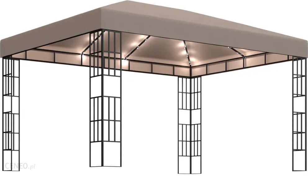 Przestronna altana będzie eleganckim dodatkiem do Twojego ogrodu, gdzie osłoni Twoich gości i rodzinę przed słońcem.Wentylowane zadaszenie powstrzyma słońce i deszcz przed zepsuciem zabawy podczas spotkań rodzinnych, grillów, popołudniowych pikników i imprez urodzinowych. Namiot imprezowy zawiera mocną, stalową konstrukcję z ozdobnymi prostokątami oraz poliestrowy dach. Zadaszenie ma wzmocnione narożniki oraz mocowania na rzep, które ułatwiają jego przymocowanie do ramy altany. Dodatkowo sznur lampek stworzy przyjemną atmosferę w ogrodzie po zachodzie słońca. Lampki nie zwiększają zanieczyszczenia środowiska, gdyż są ładowane energią słoneczną w ciągu dnia.Uwaga: altana nie jest konstrukcją stałą, dlatego zalecamy nie pozostawiać jej rozstawionej podczas niekorzystnych warunków pogodowych.Kolor altany: taupe (szarobrązowy)Kolor światła: ciepły białyMateriał: tkanina (100% poliester), stalWymiary: 4 x 3 x 2,6 m (dł. x szer. x wys.) Wysokość okapu: 200 cmDługość każdego sznura: 6 mLiczba LED: 43Odległość między diodami LED: 0,25 mOdległość pomiędzy złączem a pierwszą diodą LED: 1 mŹródło zasilania: energia słonecznaRama z ozdobnymi czworokątamiZadaszenie z zapięciami na rzepWymagany montaż: tak