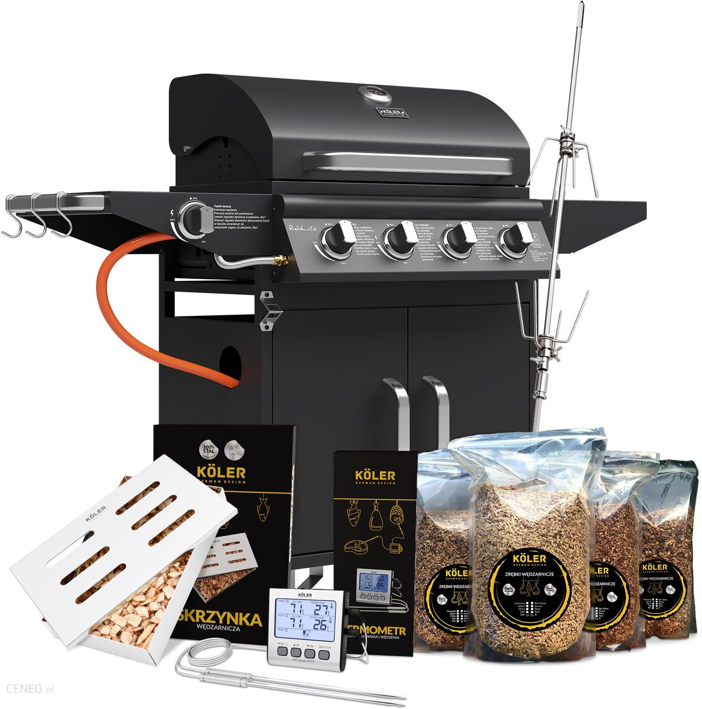 Zobacz prezentacje produktuZobacz prezentacje produktuZobacz prezentacje produktuWYSOKA JAKOŚĆZalety nowoczesnego grilla gazowego Köler V2Grill gazowy Köler V2 został wykonany ze stali nierdzewnej, przez co jest odporny na działanie czynników zewnętrznych. Dzięki temu możesz cieszyć się niezawodnym urządzeniem przez długie lata. Umożliwia dwa sposoby grillowania – na ruszcie lub płycie, co pozwala na wydobycie innego smaku. Dzięki dwóm, żeliwnym rusztom możesz przygotowywać jeszcze więcej aromatycznych i smacznych dań. Utrzymanie komponentów w czystości będzie naprawdę proste. Gdybyś jednak potrzebował jeszcze więcej miejsca do grillowania, urządzenie wyposażone jest w trzeci ruszt. Żeliwna płyta, łatwa w czyszczeniu i konserwacji, również Ci na to pozwoli. Możliwość regulacji mocy grilla powoduje, że potrawy nie będą się przypalać. Dodatkowy palnik boczny służy do podgrzewania potraw lub utrzymania w optymalnej temperaturze już przygotowanych. Grill gazowy Köler V2 wyposażono również w przydatne gadżety, takie jak: otwieracz do butelek, uchwyt na łopatki do grillowania, bezpieczne miejsce na schowanie butli z gazem oraz solidne kółka pozwalające na swobodne przemieszczanie urządzenia.WYSOKA JAKOŚĆGrill gazowy Köler V2 – sposób na zdrowsze i smaczniejsze potrawyCoraz więcej miłośników grillowania wybiera grille gazowe. Dzięki nim przygotowanie potrawy jest szybsze, wygodniejsze i tańsze. Niektórzy mają jednak obawy o ich inny, gorszy smak. Przyrządzone zarówno na grillu gazowym Köler V2, jak i tradycyjnym, węglowym wykazują niemal identyczny, wręcz niemożliwy do odróżnienia. Ponadto grillowanie na urządzeniu gazowym jest zdrowsze. Korzystanie z grilla węglowego wiąże się z wydzielaniem węglowodorów aromatycznych o działaniu rakotwórczym. Podczas obróbki cieplnej wytwarzane są także rodniki negatywnie wpływające na przemiany metaboliczne organizmu i przyspieszające jego starzenie. Jeśli więc nie chcesz rezygnować z delektowania się grillowanymi potrawami i zależy Ci na utrzymaniu dobrej formy oraz zdrowia, wybierz grill gazowy Köler V2 wyposażony w 5 palników. To nowoczesna, zdrowsza alternatywa dla tradycyjnych rozwiązań.Dodatkowy Palnik bocznyUczta na całego? Bonusowy palnik pozwoli Ci podgrzać inne potrawy, lub zapewni odpowiednią temperaturę przygotowanym już przysmakom.Stabilne kołaMobilny tylko wtedy, kiedy tego zechcesz. Blokowanie kół uniemożliwi niechciane przemieszczanie się konstrukcji, a i też w razie potrzeby – łatwo umożliwią zmianę miejsca.KonstrukcjaSolidna! Nierdzewna stal jest gwarantem tego, że przez długie lata możesz cieszyć się niezawodnością i odpornością na czynniki zewnętrzne.Dodatkowy rusztBrak miejsca na nowe przysmaki? Bez obaw! Dzięki dodatkowej przestrzeni z łatwością utrzymasz temperaturę przyrządzonych już potraw. Technologia spieku ceramicznego zapewnia łatwe czyszczenie i konserwację.Otwieracz do butelekPrawdopodobnie jedna z najbardziej praktycznych funkcji grilla. Wielozadaniowość w każdym calu!Miejsce na butlęDedykowana przestrzeń na butlę gazową z łatwością pozwoli Ci uniknąć niepotrzebnego zajmowania przestrzeni wokół grilla. Wszystko kompleksowo w jednym miejscu!Multifunkcyjne paleniskoSolidne dwa ruszty i żeliwna płyta z łatwością pozwolą Ci zrealizować nawet najbardziej ambitne, kulinarne plany. Dziel, rządź i grilluj!W ZESTAWIENajlepiej dobrany duetRuszta żeliwne + płyta żeliwnaCo po najlepszym jakościowo produkcie położnym do przyrządzenia, jeśli sam ruszt nie będzie prezentował odpowiedniej? W tym przypadku po prostu nie ma takiej możliwości, bo żeliwny ruszt i płyta stanowią idealne połączenie, aby zrealizować wszystkie Twoje gastronomiczne fantazje. Ruszt pozwala na wydobycie pełni aromatu i smaku z przyrządzanych potraw, a płyta stanowi idealne uzupełnienie, jeśli preferujesz inny sposób grillowania.Niezależnie od wyboru sposobu możesz być pewien jakości – materiału, jak i tego co finalnie ściągasz na talerz!Kupując Grill poniższe produkty o łącznej wartości 400 zł otrzymujesz GRATIS:Reduktor + WążGRATISNiezbędny, jakościowy element, aby w pełni cieszyć się bezpiecznym grillowaniem.Podłącz do butli i niech rozpocznie się uczta!Płyta żeliwnaGRATISJedna ze stron świetnie sprawdza się podczas pieczenia mięs i warzyw, natomiast druga pozwala na przyrządzanie delikatnych ryb czy owoców morza.Pokrowiec grillaGRATISPogoda nie sprzyja? Sezon grillowy zbliża się ku końcowi? Z odpowiednią ochroną spokojnie zabezpieczysz grilla przed wilgocią i innymi niepożądanymi czynnikami zewnętrznymi.Powiększ swój zestaw o:Niezawodne akcesoria!Dodaj do koszykaRożen elektryczny do grilla gazowego 5,3W299,00złDodaj do koszykaTermometr do grillowania Köler139,00złDodaj do koszykaZestaw 6 szpadek do szaszłyków Köler139,00złDodaj do koszykaStojak na podudzia z brytfanną Köler115,00złDodaj do koszykaSzpila do szaszłyków 21cm – 1szt7,00zł 5,00złDodaj do koszykaSzpatuła do steków i hamburgerów 150mm79,00zł 59,00złDodaj do koszykaZestaw do wędzenia – Standard195,00zł 185,00złDodaj do koszykaZestaw 2 akcesoriów grillowych Köler249,00złDodaj do koszykaZestaw 2 akcesoriów szczypce + łopatka79,00złDodaj do koszykaKamień do PIZZY kordierytowy 38cm Köler189,00złDodaj do koszykaBrytfanna ze stojakiem do grillowania drobiu Köler199,00złDodaj do koszykaZestaw 3 akcesoriów grillowych KÖLER w etui139,00złPremiumAkcesoriaMarki Koler Zobacz wszystkieRożen elektryczny KÖLERRożen obrotowy do grilla służy do przygotowywania pysznych dań z mięsa, ryb oraz warzyw. Sprzęt ten znajdzie zastosowanie w lokalach gastronomicznych bądź food truckach. Dzięki uniwersalności i prostej obsłudze przyda się także przy organizacji przyjęć na działce lub campingu.299,00złDodaj do koszykaPłyn do mycia grillaProfesjon